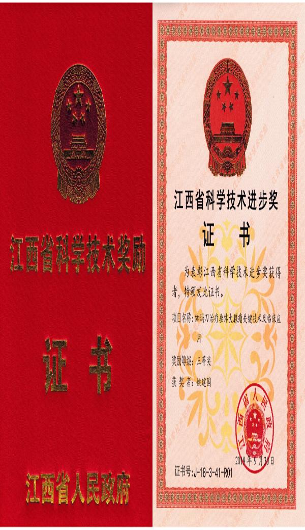 江西省医学科学院党委书记姚建国带领团队完成的《伽玛刀治疗垂体大腺瘤关键技术及临床应用》荣获了2018年江西省科技进步奖三等奖,是我院首次获该类奖项。